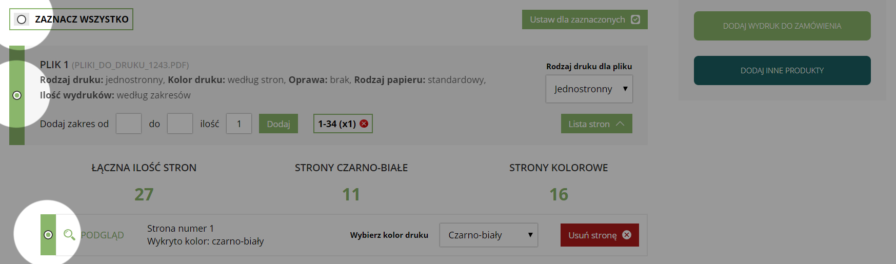 Właśnie przeanalizowaliśmy zawartość przesłanego przez Ciebie dokumentu PDF pod kątem kolorów poszczególnych jego stron. Teraz możesz samodzielnie skonfigurować opcję wydruku zarówno dla całego dokumentu, jak i poszczególnych jego stron. Po ustawieniu opcji wydruku dodaj wydruk do koszyka, wprowadź dane adresowe i złóż zamówienie.